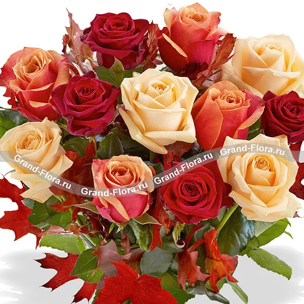 9 роз: Подарочный сертификат магазина Летуаль на сумму 2000р., роза красная - 4 шт.(70см), роза оранжевая - 3 шт.(70см), роза кремовая - 2 шт.(70см), Декор - осенние листья.